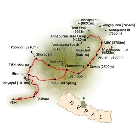 From Pokhara the trek leads first towards Annapurna Base Camp in the heart of the Annapurna Sanctuary to enjoy an arena view of the 4 Annapurnas (I, 8091m 10th highest mountain and II-IV) and other peaks all above 7000m. Then returning to Chimrong, and from here heading west through alpine forests to Kopra ridge.